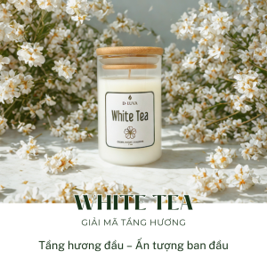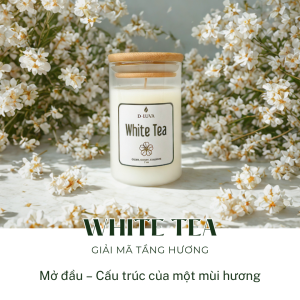 Ở giai đoạn cuối, trà trắng dần lộ diện và trở thành lớp nền của toàn bộ mùi hương. Đây là nốt hương mang cảm giác sạch, nhẹ và thư thái, giống như dư vị của một tách trà ấm trong không gian yên tĩnh. Trà trắng giúp giữ cho tổng thể mùi hương trở nên cân bằng, tinh tế và kéo dài trong không gian một cách rất nhẹ nhàng.